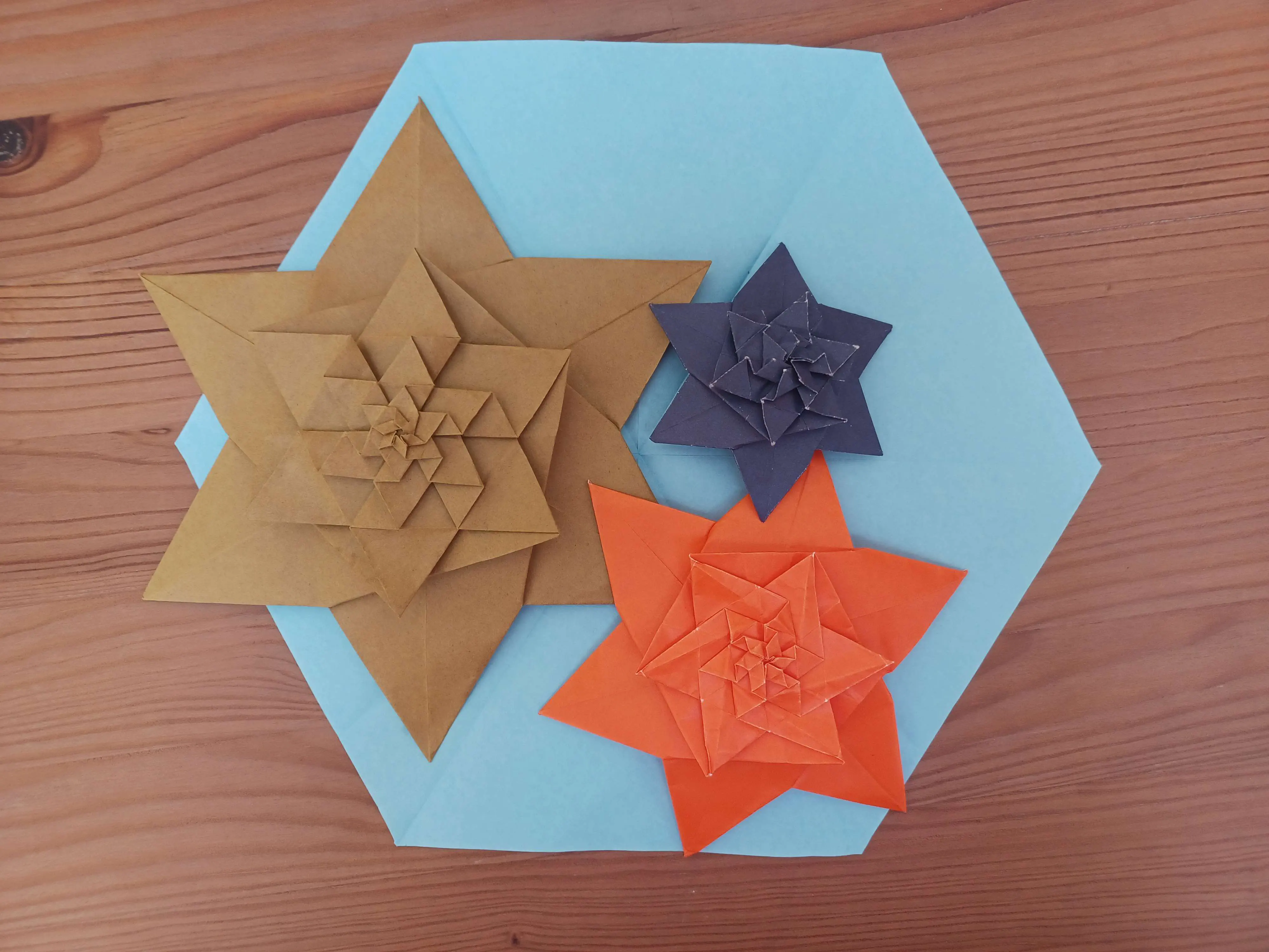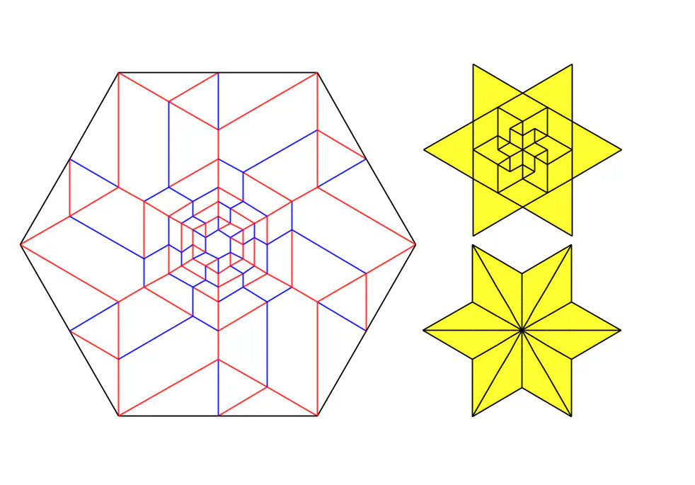 This design was a rather coincidental discovery while trying to figure out one of Shuzo Fuchimoto’s designs. I had an idea and immediately cut a new hexagon to try it out. I later learned that the recursive portion of the Recursive Blossom is identical to the recursive version of Shuzo Fuchimoto’s Petals (CFW 85) independently discovered by Michal Kosmulski, Andrew Hudson, Edward Minstretta and now me.